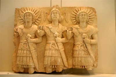 Les trois divinités majeures de la ville sont représentées sous l’aspect de soldats romains. Baal, qualifié de « Seigneur du ciel » ou « Chevaucheur des nuées » paraît entre le dieu-lune Aglibôl à sa droite et le dieu-soleil Malkbêl à sa gauche.